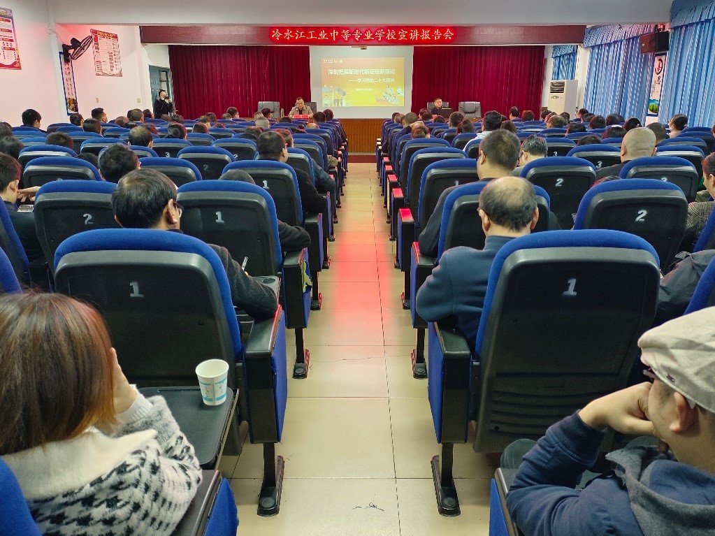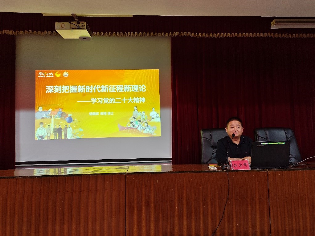 近日,为深入学习贯彻党的二十大精神,按照市委宣讲团统一安排部署,我院副院长杨国辉教授至冷水江工业中等专业学校现代技术大楼三楼大会议室做了题为《深刻把握新时代新征程新理论——学习党的二十大精神》的宣讲报告。活动由冷水江工业中等专业学校党委委员、副校长吴彪雄主持,冷水江工业中等专业学校全体教职员工参加。