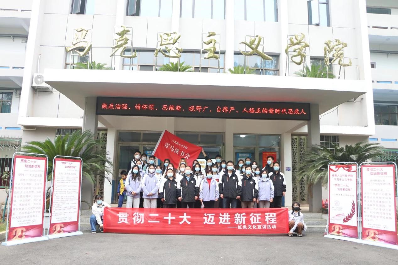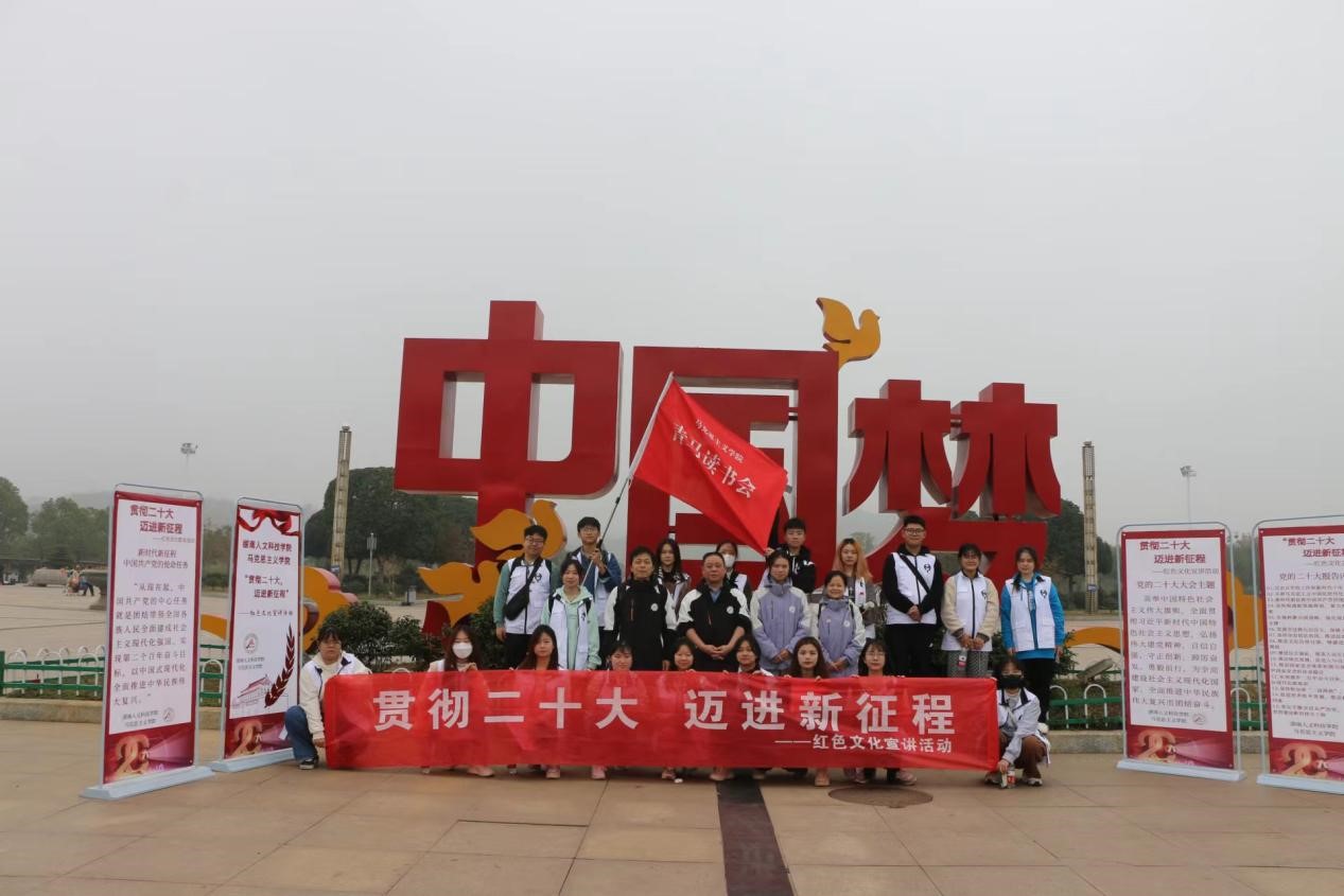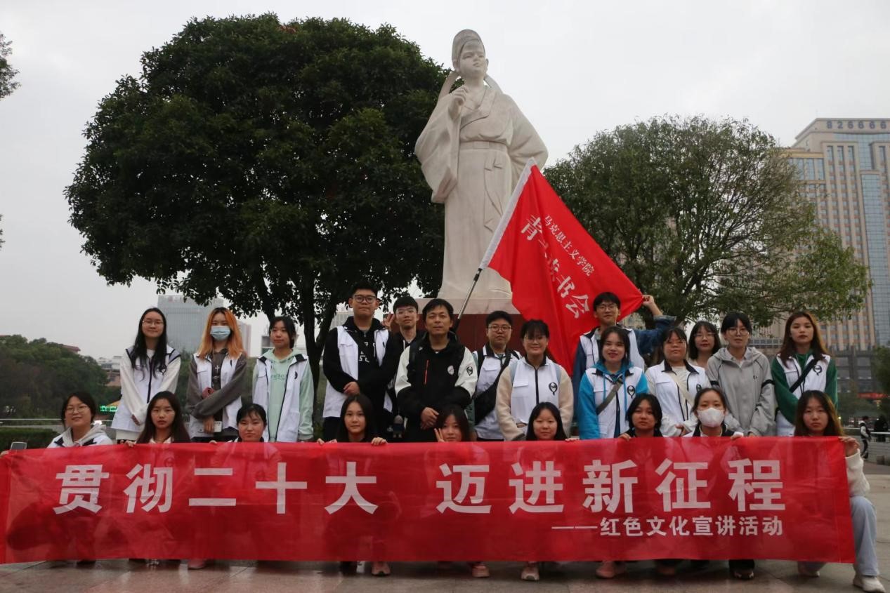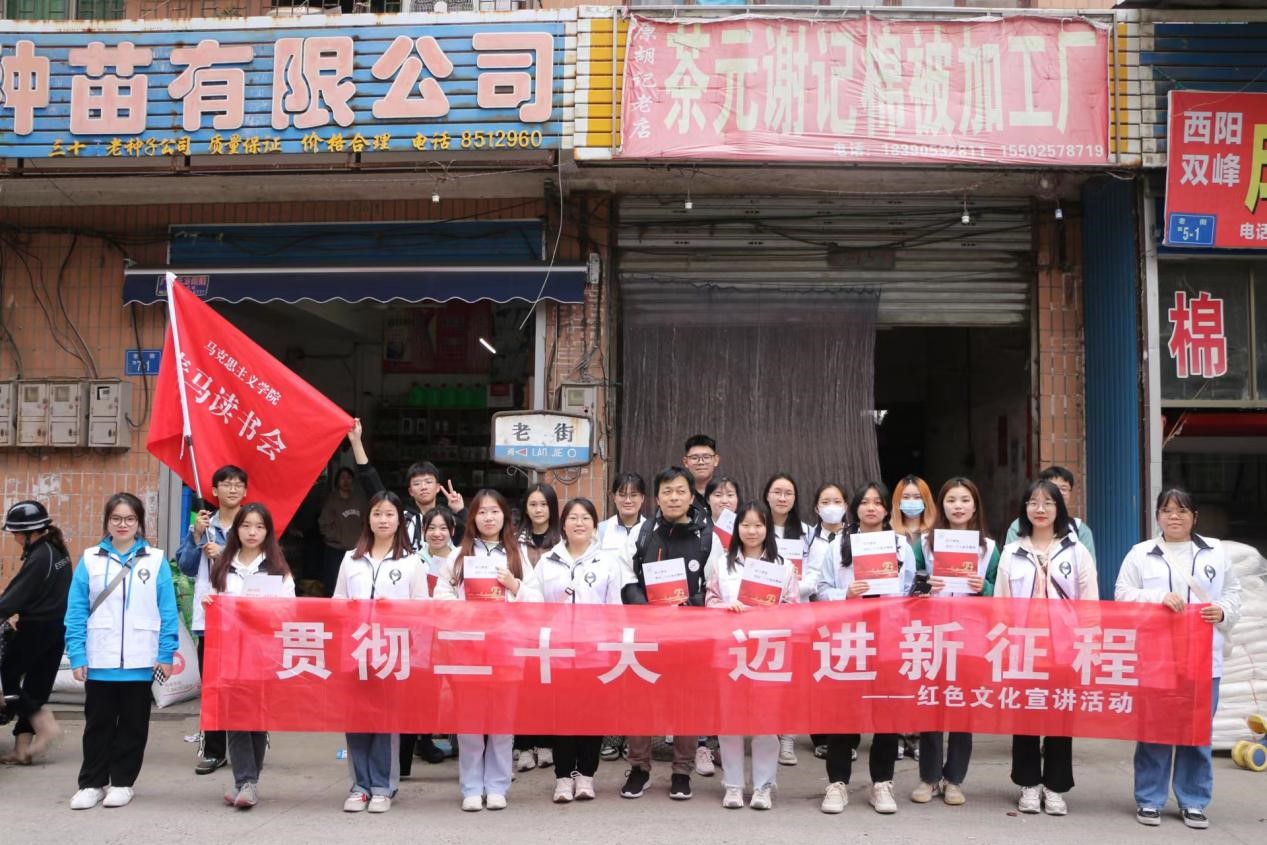11月4日,beat365中文官方网站“贯彻二十大,迈向新征程”——红色文化宣讲活动在若谷楼拉开序幕。本次活动由我院与校学工协同主办、青马读书会承办,组织一批志愿红色宣讲队伍面向全市流动开展以“贯彻二十大,迈向新征程”为主题的红色文化宣讲。我院党总支书记李伶、院长张卫明、副院长杨国辉、党总支副书记周友以及思政课教师代表和学生志愿者一同参加。