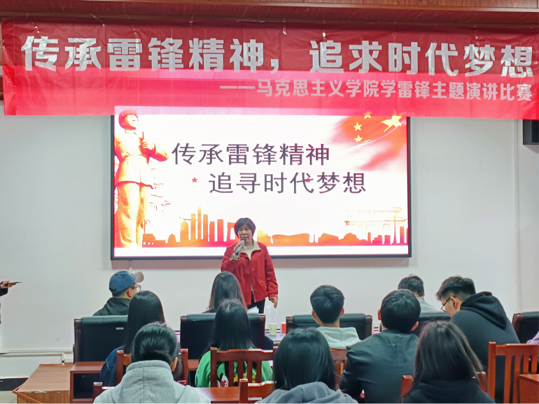 3月14日,我院于若谷楼116成功举办了以“传承雷锋精神,追寻时代梦想”为主题的演讲比赛。此次演讲比赛旨在激励更多大学生在党的二十大精神的指引下,传承雷锋精神,为实现中华民族伟大复兴团结奋斗。此次比赛特邀院党总书记李伶、院团总支书记周浩、教师李婉溶以及辅导员助理寥承庆担任评委。