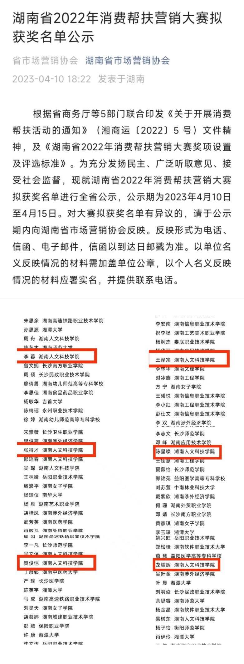 近日,湖南省2022年消费帮扶营销大赛获奖名单公布,辅导员张得才以身作则,带领李蓉、王泽宗、贺俊恺、龙耀辉、陈星璨、禹浩然等同学荣获省级优秀个人奖,其中王泽宗、贺俊恺两位同学被评为湖南省2022年消费帮扶营销大赛先进个人。