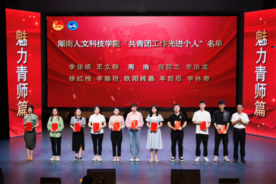 表彰会上,马克思主义学院童明玉同学参加了隆重的入团仪式,老师为其颁发团员证并佩戴团徽。颁奖环节,马克思主义学院在2022年度致力于创新团学工作模式、打造系列精品活动,取得了可喜的成绩,斩获多项集体荣誉及个人荣誉。其中,我院周浩和黄海多次上台领奖。在集体荣誉中,学院团总支荣获学校优秀团总支称号,团总支书记周浩上台领奖,2022级思政2班荣获学校优秀团支部称号,“麦芒计划”志愿服务团获评省级暑假社会实践先进团队称号。在个人荣誉中,团总支书记周浩获评学校优秀团工作先进个人、娄底市优秀共青团干部称号,黄海获评中国自强之星大学生称号,刘美其荣获公益行动奖,申佳梨、黄海荣获社会实践奖,马伍程等同学获评学校优秀团干部称号,刘捷等同学获评学校优秀团员称号,周欣仪等同学获评学校优秀志愿者称号,曹睿钊捐献熊猫血救助白血病患者,获评娄底市无偿献血先进个人称号,他在现场采访中说道:“作为新时代青年大学生,应该力所能及地帮助他人、服务社会,希望未来会有更多的青年大学生加入到无偿献血这项公益活动中。”