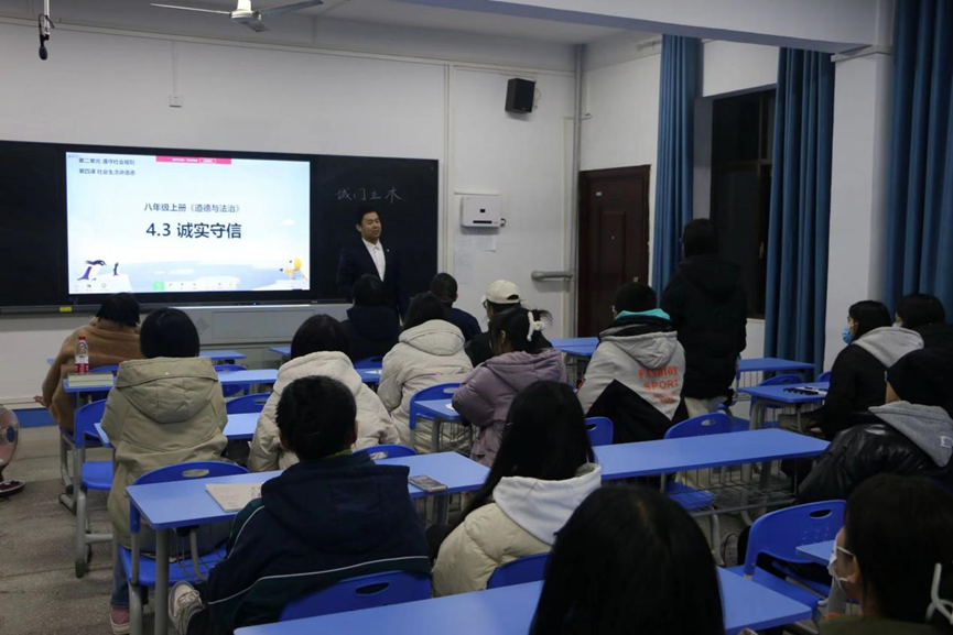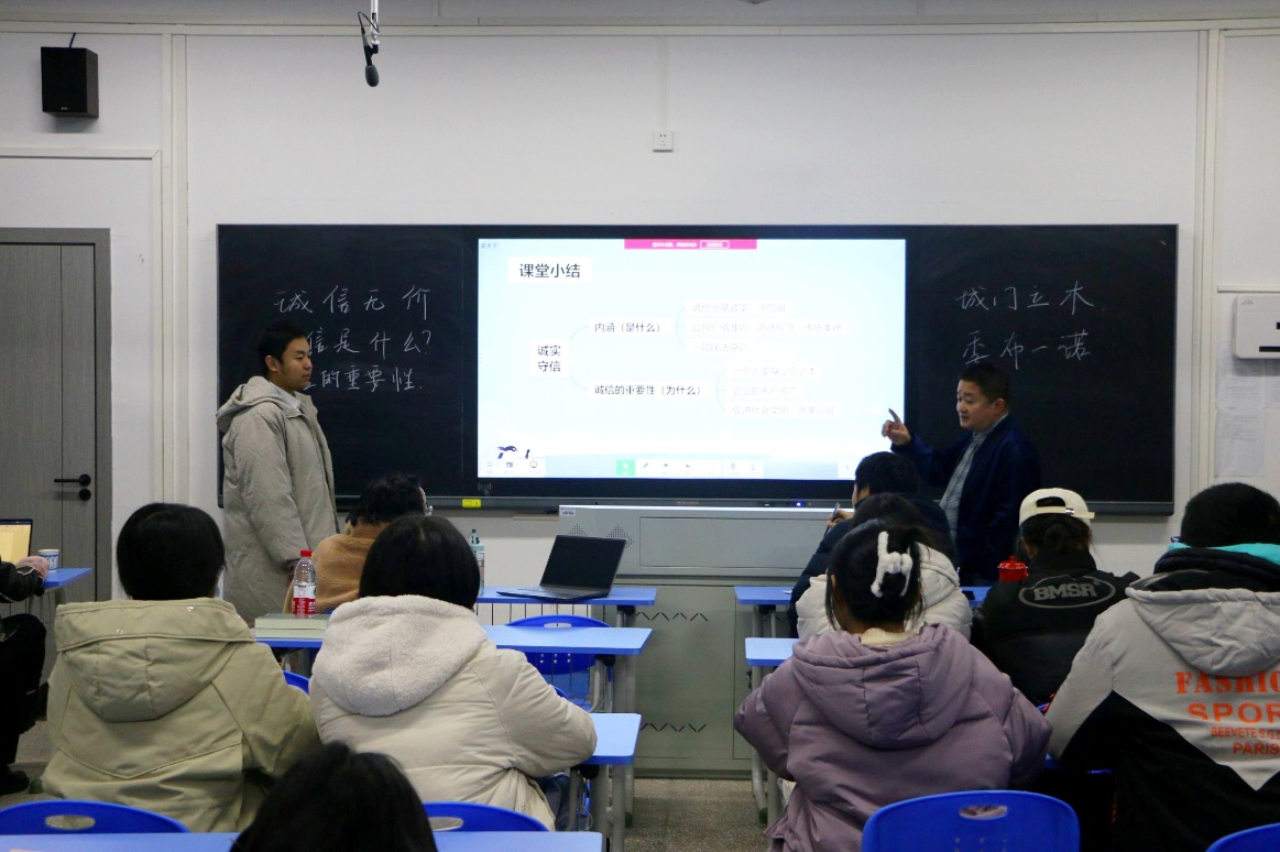 杨院长表示,本次师范生技能提升交流论坛为全体学生了解师范生技能大赛、提高师范生技能搭建了交流学习的平台,希望大家能在交流中发现不足、及时反思、取长补短,切实提高自身教学技能,积极展现思政教师后备军的风采。随后,张倪、陈浏平、麻璇等多名师范生上台试讲,后张倪同学向大家进行课堂展示。第一堂课上,张倪同学先以张桂梅校长的事例引入“服务社会”这一主题,同时结合名言警句、具体实例以及身边小事指出服务社会的意义和服务社会的方法与途径,提出我们青年应担当民族复兴的历史重任,努力为社会做贡献。第二堂课上,张倪同学借助希沃白板等多媒体手段,以《诚信》为主题展开课堂教学,向同学们展示如何运用好多媒体设备进行教学。