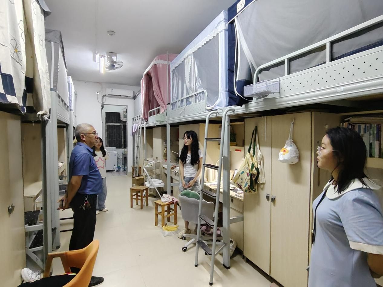 7月4日晚,我院副院长成赛军、党总支副书记阳青带领辅导员、班主任走进学生寝室进行暑假返乡归家安全教育,同时开展学生离校离宿安全卫生排查工作。