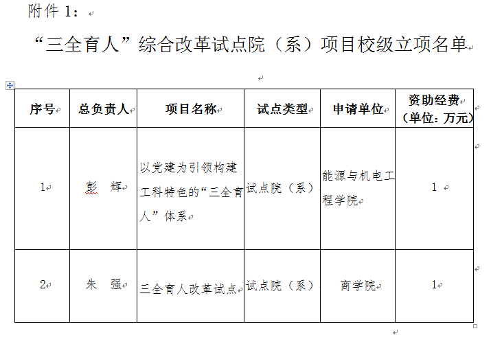 1.“三全育人”综合改革试点院(系)项目校级立项名单