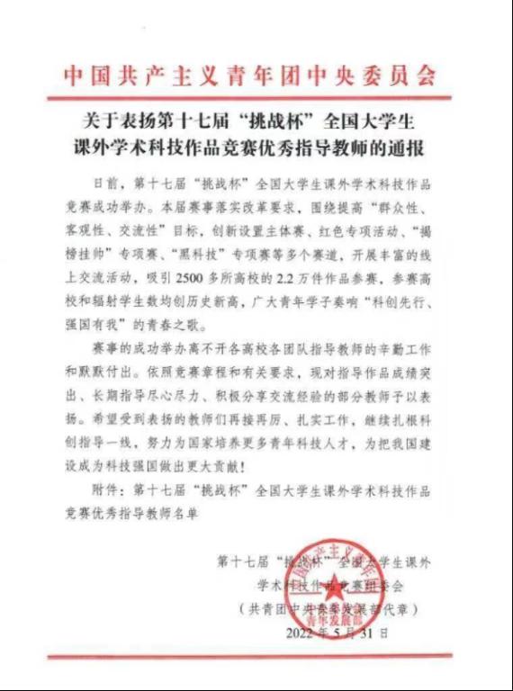 据悉,该项荣誉称号由“挑战杯”全国赛事组委会根据大赛章程和教师指导作品获奖情况进行评选,用于表彰长期支持、指导学生参加“挑战杯”竞赛的优秀教师。我将继续支持大学生创新创业教育工作,优化创新创业教育工作体制机制,支持更多青年教师扎根指导一线,助推创新创业人才培养。供稿人邓婧莹
