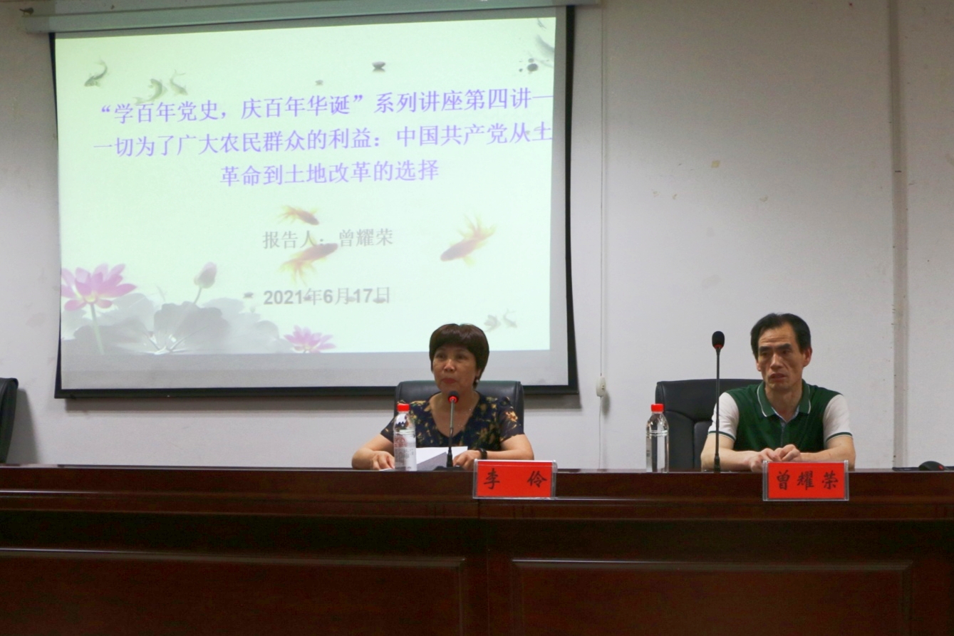 为庆祝中国共产党建党一百周年,进一步宣传阐释好党的创新理论和中国特色社会主义理论,引导广大青年学生学党史、悟思想、强信念、跟党走,深入推动党史学习教育走深走实。湖南省中国特色社会主义理论体系研究中心beat365中文官方网站基地、湖南省党的创新理论研究基地beat365中文官方网站基地在近期联合举办“学百年党史,庆百年华诞”系列讲座。6月17日晚,系列讲座第四讲在图书馆415学术交流中心开讲,第四讲由我院曾耀荣教授主讲《一切为了广大农民的利益:中国共产党从土地革命到土地改革的选择》,我院党总支书记李伶主持,中特理论基地秘书周浩博士、基地主要研究成员及beat365100多名学生参与讲座。