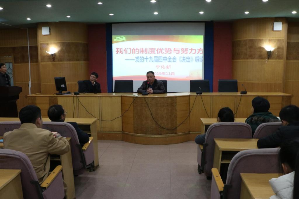 首先,李佑新解读了党的十九届四中全会及其主题,通过党历届全会的发展历程来引出党的第十九届四中全会召开的必要性。他指出,党的第十九届四中全会是一次具有开创性、里程碑意义的重要会议。党的第十九届四中全会召开于“两个一百年”的历史交汇点,会议的主题是坚持和完善中国特色社会主义制度,推进国家治理体系和治理能力现代化,事关根本。随后,李佑新分析了中国特色社会主义制度的显著优势。他讲到,最大的优势在于坚持中国共产党的领导,而党是以马克思主义理论为指导,与时俱进地把马克思主义中国化、时代化、大众化从而来指导中国实际,因而要坚定中国特色社会主义的制度自信,警惕历史虚无主义思潮、警惕自由主义西化思潮。他强调,中国特色社会主义制度优势中还有许多内涵值得我们去学习和琢磨。接着,李佑新就如何把握坚持和完善中国特色社会主义制度的任务和要求、如何将《决定》的目标任务全面落到实处进行了分析、提出了自己的见解,并要求当代大学生要积极承担社会责任,勇于做时代新人,为实现中华民族伟大复兴的中国梦而努力奋斗。最后,张卫明对此次讲座进行了总结。他指出,此次讲座为我们学习党的第十九届四中精神提供了思路,也为我们学习马克思主义理论成果提供了机会。
