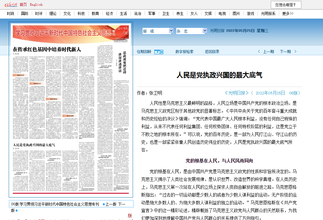 2022年5月25日,《光明日报》(理论版)刊发了我院院长、马克思主义理论省应用特色学科带头人、思想政治教育省一流专业负责人、中国特色社会主义理论体系研究中心beat365中文官方网站基地首席专家张卫明教授《人民是党执政兴国的最大底气》一文,这是张教授第六次在《光明日报》发表理论文章。