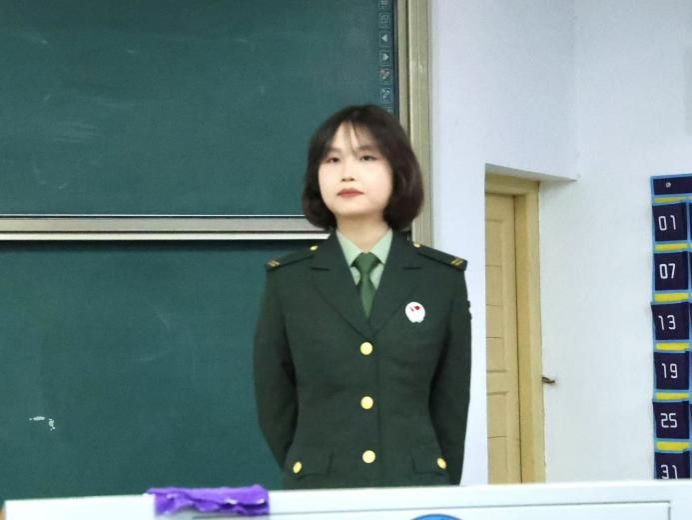 宣讲过程中,刘恰身着绿色纪念衫,以清晰有力的话语,讲明当前现代化军队建设对高素质人才的需求,强调"强军梦与青春梦同频共振"的时代命题。随后,刘恰从经济补贴、荣誉表彰、军旅成长路径、学业保障及就业创业扶持五大维度切入,系统梳理参军入伍的全周期优待政策,并结合师范生特点重点解析学业衔接细则。同时,她对视力标准、政审流程等报名条件中的关键环节进行了针对性说明。最后,刘恰讲述军营中训练时的艰辛与战友情深的温暖,并鼓励同学们积极地投身于军旅征程。
