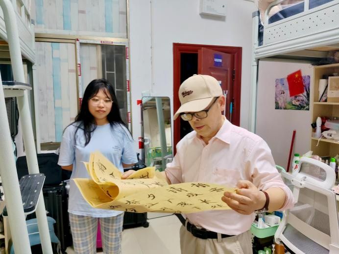 在排查过程中,老师们秉持认真负责的态度,仔细排查寝室中可能存在的各类安全隐患,收缴了个别大功率电器对个别同学现场进行了严肃的批评教育,向同学们着重强调寝室用电安全和防火安全的重要性。老师们就“书香寝室”和“文明寝室”的建设意义,指出书香寝室需营造浓郁的学习风气与文化氛围,让“香”弥漫于知识的汲取与思想的交流中。同时,老师们鼓励同学们积极做好文明寝室评选准备,以评促建,以评促发展,打造整洁、和谐、积极向上的宿舍环境。排查过程中,老师还亲切地与学生讨论软笔书法,为学生们软笔书法的进步提出建议,师生间情谊融融,联系更加紧密。