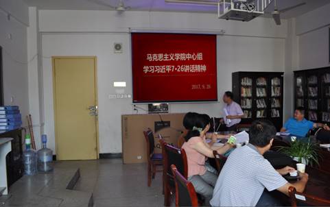 为了更好的贯彻落实习近平7·26讲话内容,2017年9月18日,我院组织开展学习习近平7·26讲话精神重要会议,党总支书记游训龙出席此会议并发表讲话,副院长杨国辉以及中心组人员参与讨论。