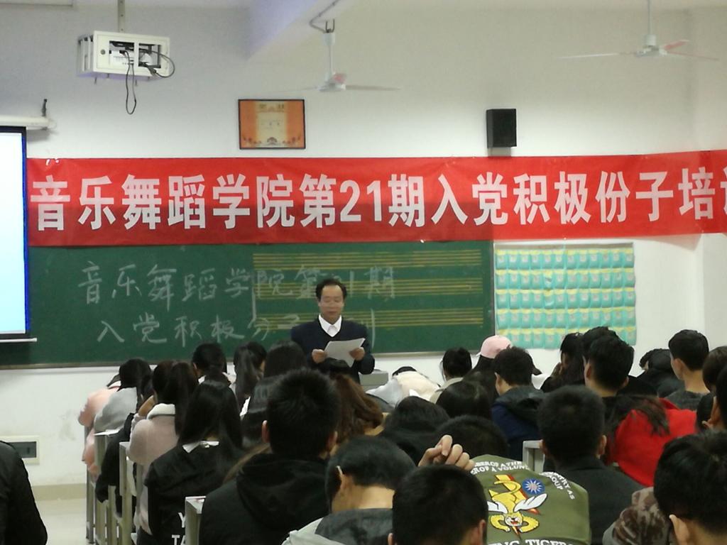 11月10日晚,音舞学院306教室座无虚席,我院党总支书记游训龙同志为音舞学院入党积极分子上党课。他讲的题目是:学习习近平总书记七一讲话精神,从以下几个方面进行解读:(一)前言;(二)三个伟大贡献;(三)三个不动摇;(四)八个不忘初心;(五)四个自信。音舞学院党总支书记陈功平做了上课前的动员讲话,学员们学习热情高涨,课堂纪律井然,效果良好。