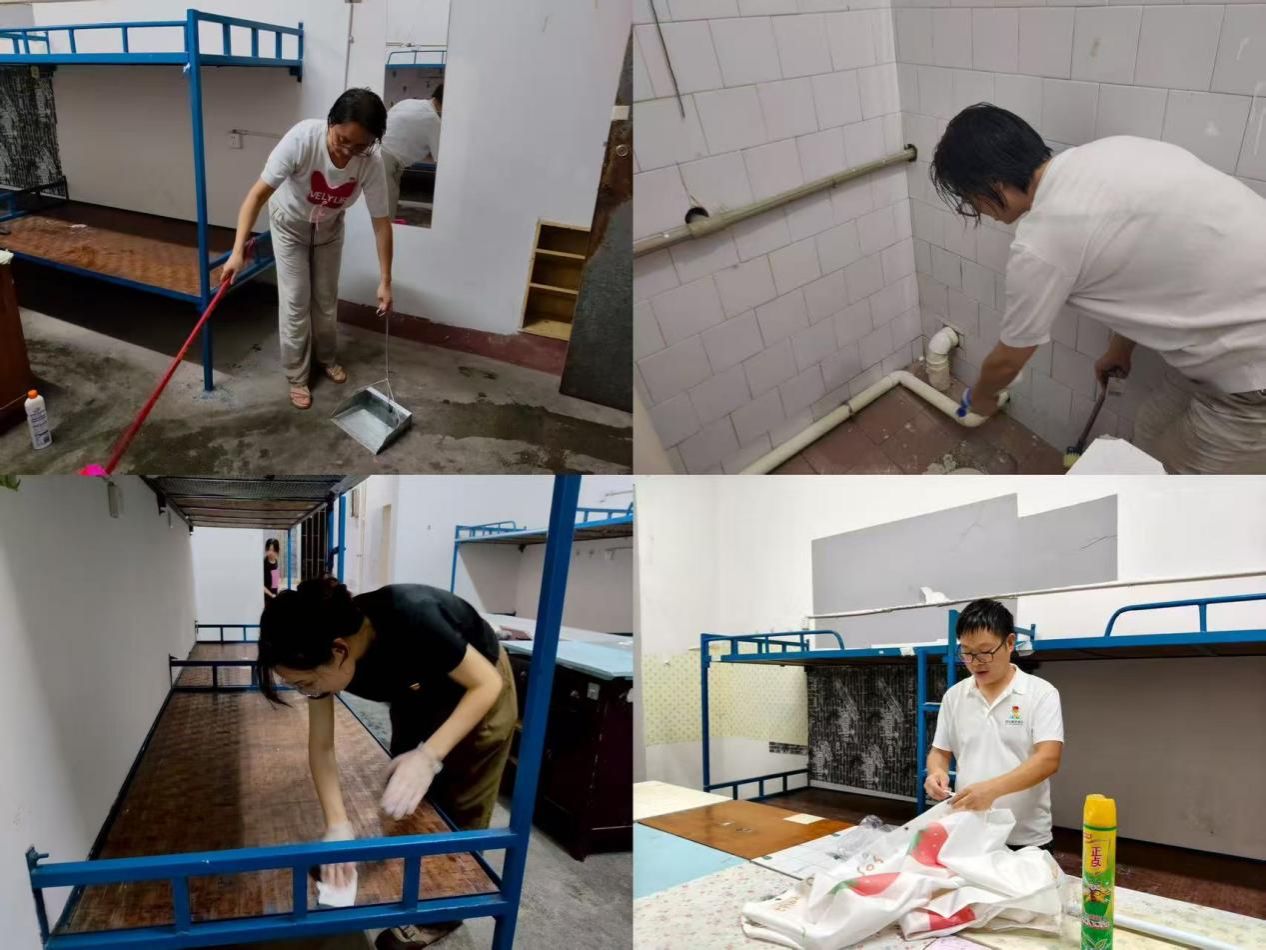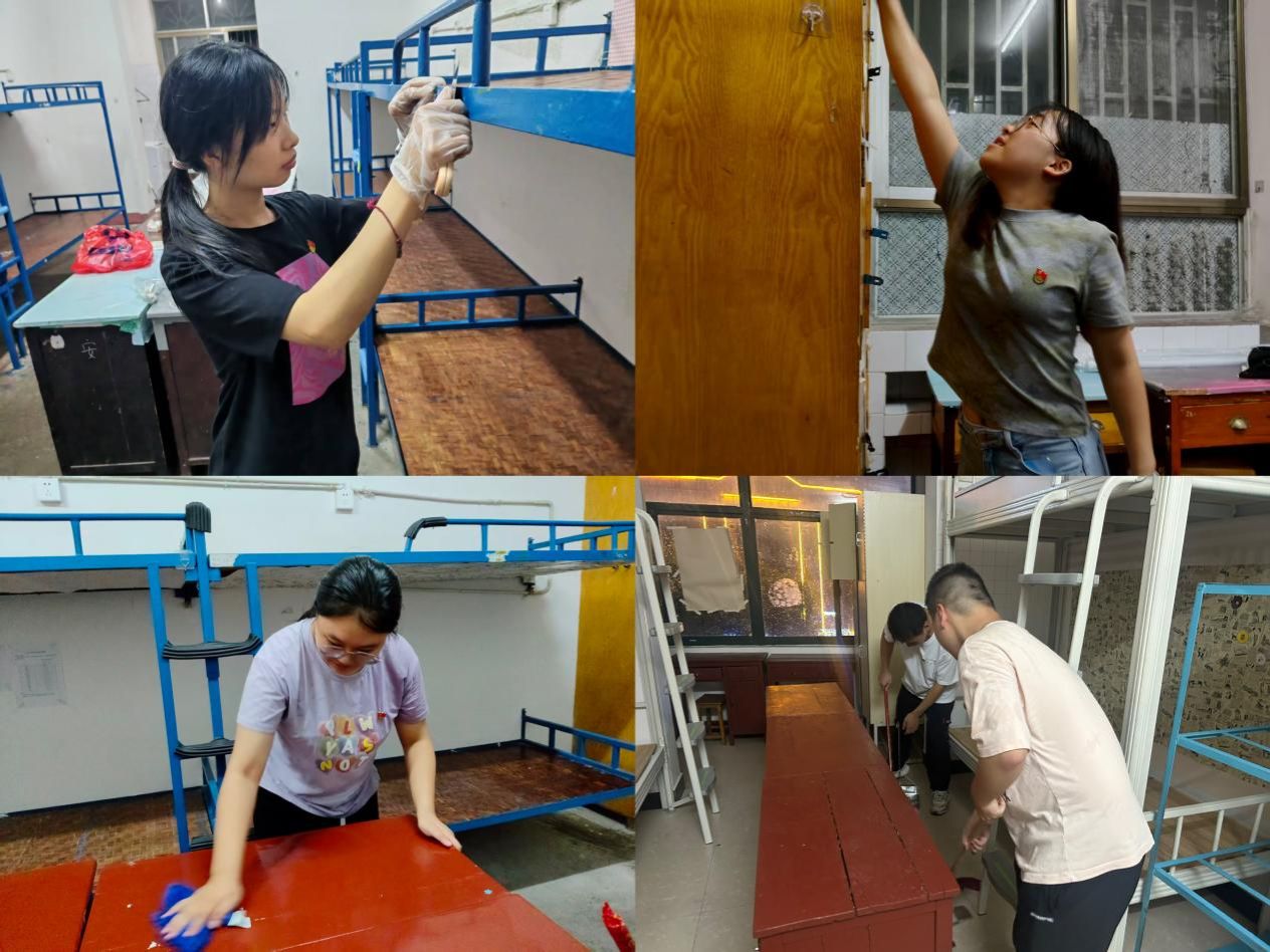 在清扫过程中,师生党员始终秉持“以学生为中心”的服务理念,想新生之所想、急新生之所急。大家分工明确、协作高效,重点对新生宿舍的床铺栏杆、书桌表面、衣柜内壁等关键区域进行细致擦拭,同时全面清扫地面浮尘、清理床底墙角等卫生死角,全力为即将入学的新生营造整洁、舒适、温馨的住宿环境。经过师生共同努力,新生宿舍环境焕然一新。