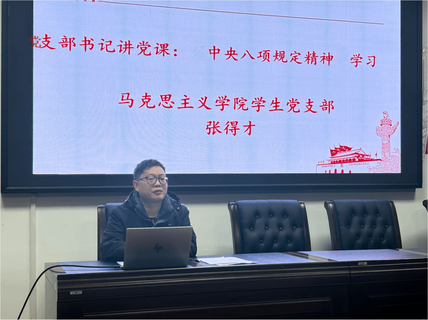 课上,张得才围绕中央八项规定精神的核心要义、实践成效及新时代青年大学生党员的践行路径等方面展开讲解。他结合学生党员的日常学习与工作实际,以作风建设为切入点,要求支部所有党员同志在思想上筑牢廉洁自律防线,在行动践行求真务实作风,真正将中央八项规定精神内化于心、外化于行。