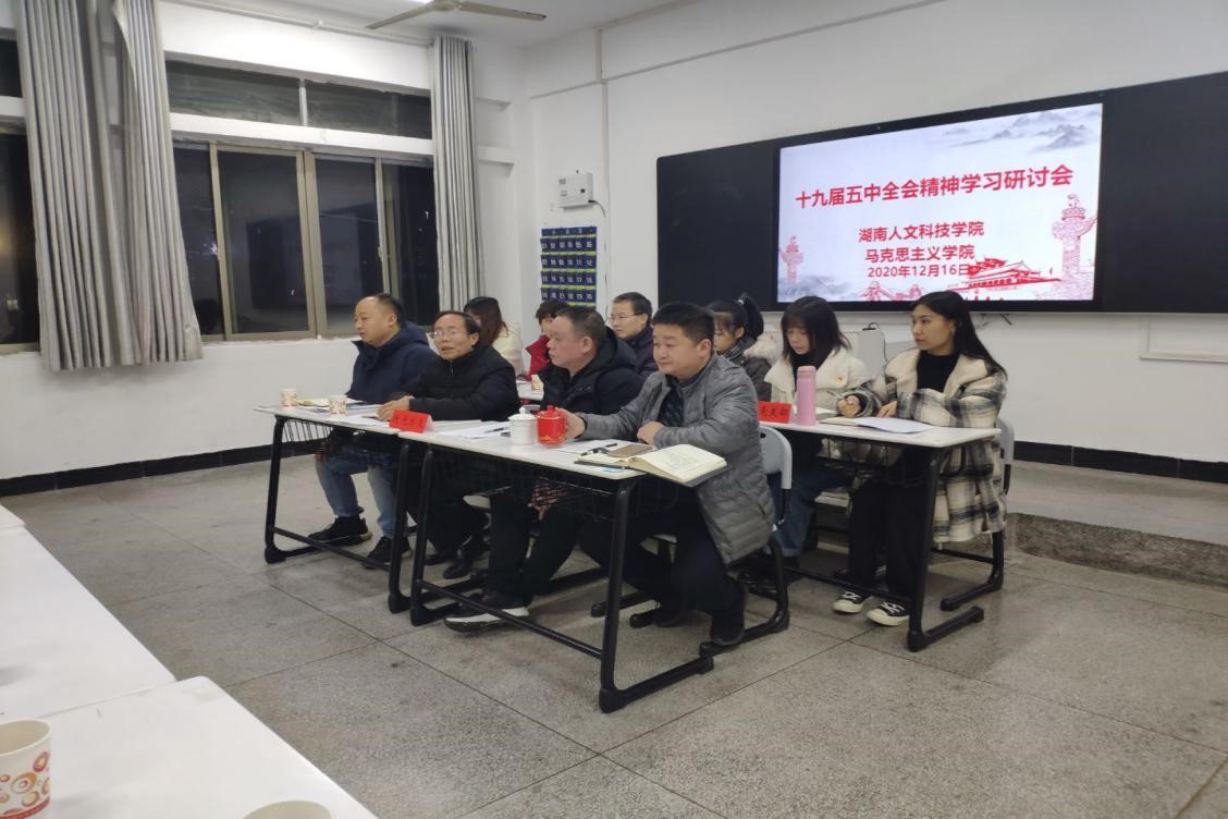 为深入学习贯彻十九届五中全会精神,12月13日晚,马克思主义学院在致远楼604教室举办十九届五中全会研讨会。马克思主义学院党总支书记游训龙、院长张卫明教授、副院长杨国辉博士、党总支副书记成伟以及马克思主义学院教工党支部、学生党支部全体成员、青马工程(骨干)培训班学员代表、娄底日报社记者代表共同参与,研讨会由游训龙教授主持。