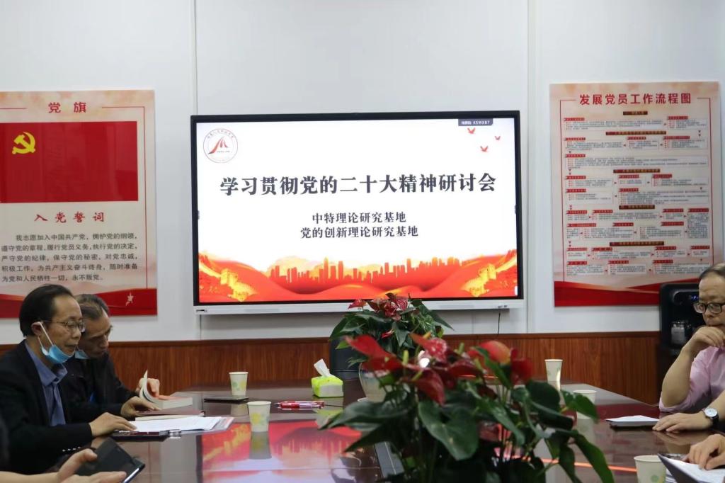 11月9日下午,中特理论研究基地和党的创新理论研究基地于若谷楼206召开党的二十大精神学习研讨会。会议由基地负责人郭军教授主持,基地首席专家张卫明、游训龙,基地秘书及骨干研究员参加会议。