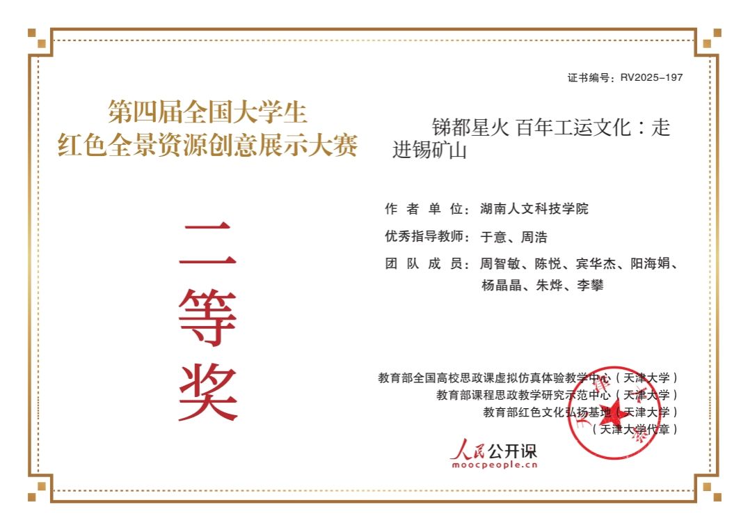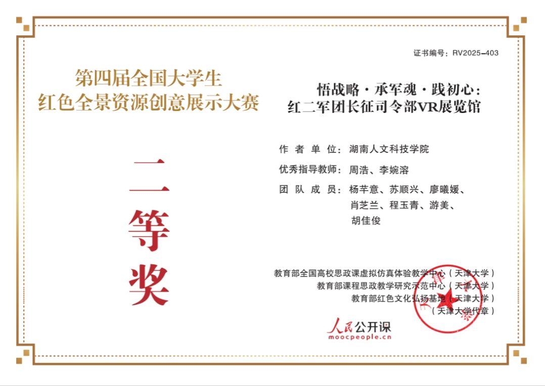 近日,第四届全国大学生红色全景资源创意展示大赛评选结果获奖名单公布,马克思主义学院“青春向党 红色筑梦”调研团创作的《锑都星火 百年工运文化:走进锡矿山》《楚怡工业记忆:在时光里触摸百年匠心》《悟战略·承军魂·践初心:红二军团长征司令部VR展览馆》三组作品,在众多参赛作品中脱颖而出,均荣获全国二等奖。