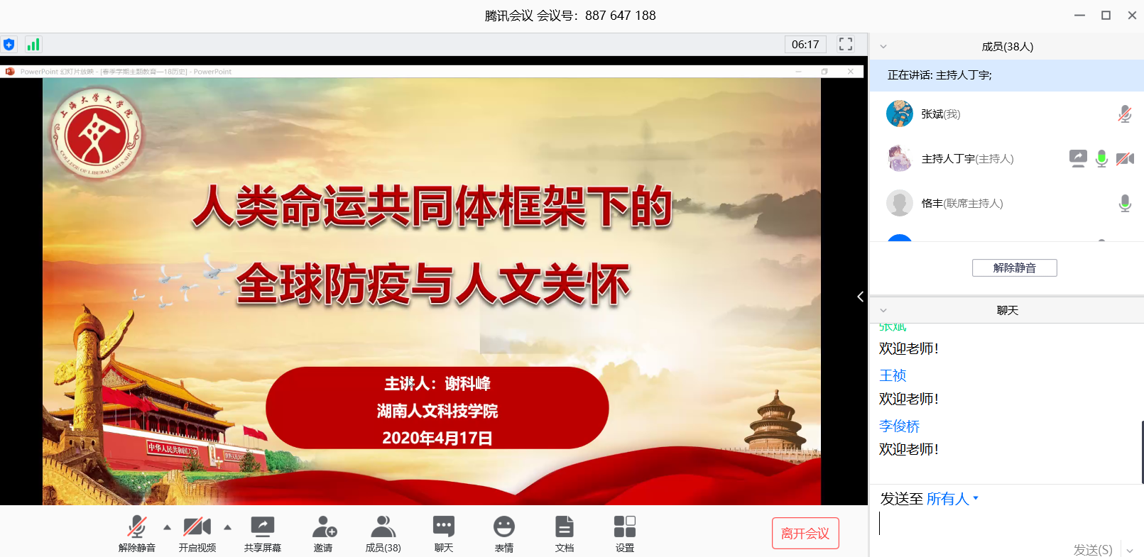 2020年4月17日下午,受上海大学历史系、上海大学文学院2018级历史系硕士研究生党支部邀请,我院谢科峰老师在线参加“共战疫情爱国力行”上海大学文学院历史系硕士研究生春季学期主题教育,并为上海大学2018级历史系硕士研究生作了一次“人类命运共同体框架下的全球防疫与人文关怀”主题讲座。