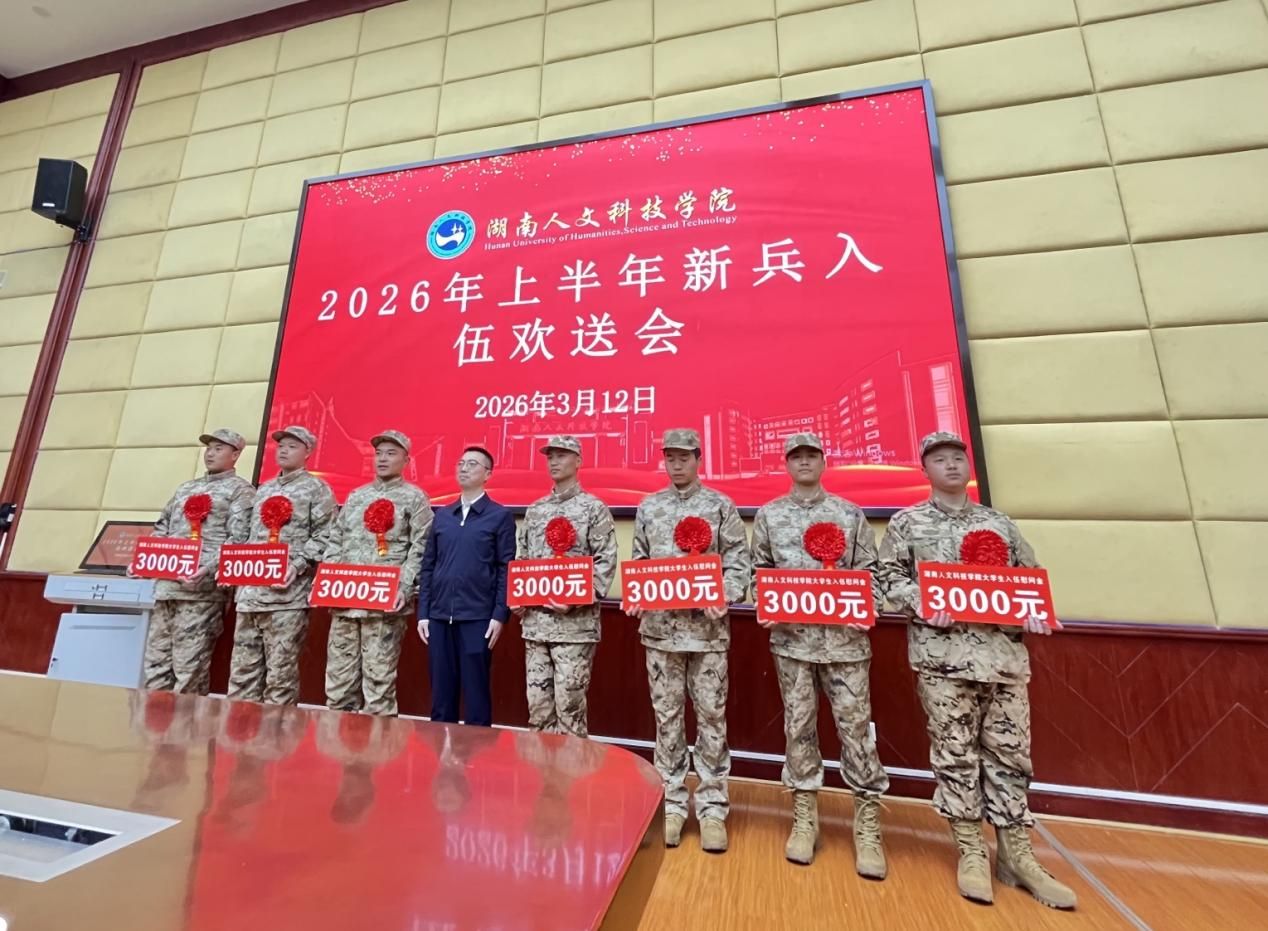 3月12日,beat365中文官方网站隆重举行2026年春季新兵欢送会。美术与设计学院学子樊航兵经过严格选拔,光荣应征入伍。学院党委副书记黄庆源、征兵专干段琦璐参加欢送仪式。