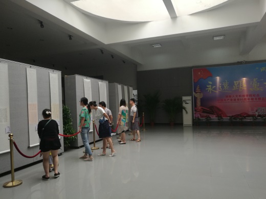 2016年7月3日,视觉传达设计系支部书记毛攀云组织全系教师在逸夫楼二楼展厅观看“永远跟党走”楷书精品展,使大家在书香墨宝的氛围中重温了党史知识、入党誓词、党章党规、习近平总书记系列重要讲话精神,以此举行纪念中国共产党成立95周年主题教育活动。