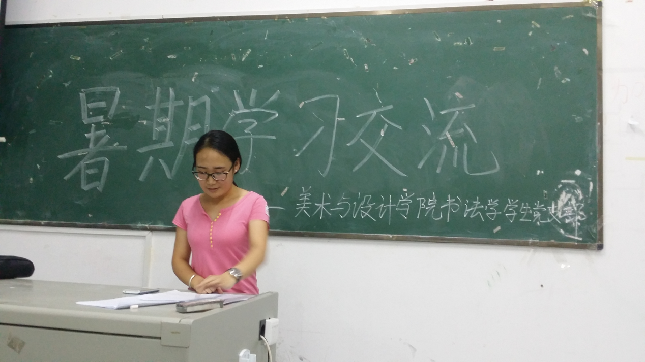 2016年8月30日晚7点30分,美术与设计学院书法学全体学生党员在逸夫楼311室召开支部党员关于“暑期学习心得交流”学习交流会议。会议由美术与设计学院书法学党支部书记张晶露主持,全体支部党员出席了会议。