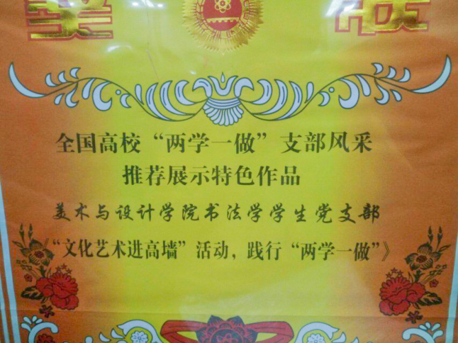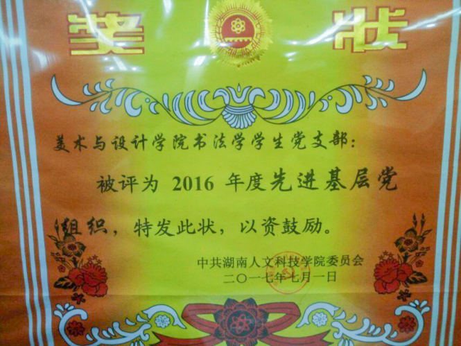 此次表彰大会中,美术与设计学院党总支、环境艺术教工党支部和书法学学生党支部均被校党委评为先进基层党组织,再一次囊括了先进基层党组织三类奖项,继续赢得基层党建大满贯。书法学学生党支部的《“文化艺术”进高墙活动,践行“两学一做”》还荣获了全国高校“两学一做”支部风采推荐展示特色作品。教师党员张晶露、刘风雪和学生党员闫晓璐、张勇、谢薛爽、薛金明获校级优秀党员称号,彭建成老师获学校优秀党务工作者称号。这充分体现了我院党建工作卓有成效,文化六进等特色活动进一步深化。