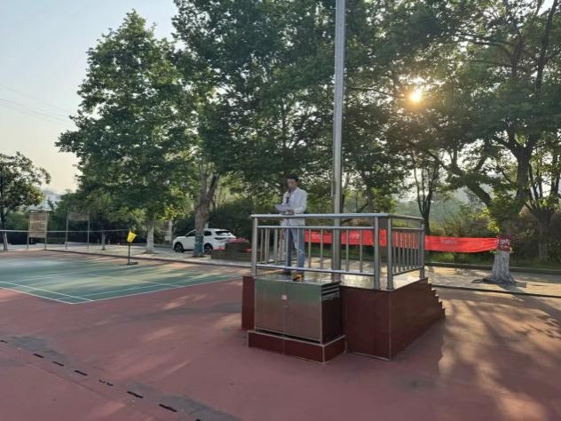 晨光中,国旗护卫队踏着坚定有力的步伐护送国旗入场。全体师生肃立注目,雄壮的国歌声响起。朝阳洒下金色光辉,五星红旗迎风展开,在庄严的注目中冉冉升起,迎风飘扬。