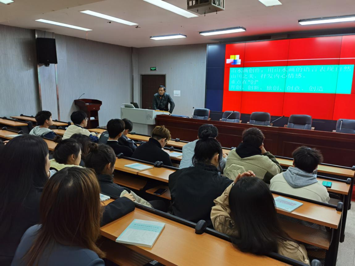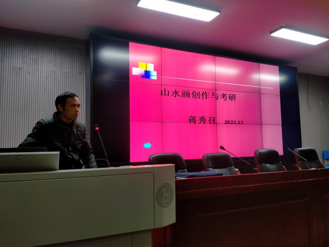 1221日下午,美术与设计学院报告厅,灯光明亮,新装不久的演讲台显得格外醒目。美术学专业教师蒋秀召以山水画创作与考研为题,结合自己有关山水画创作研究的心得体会,为美术学专业师生作了一场学术讲座。