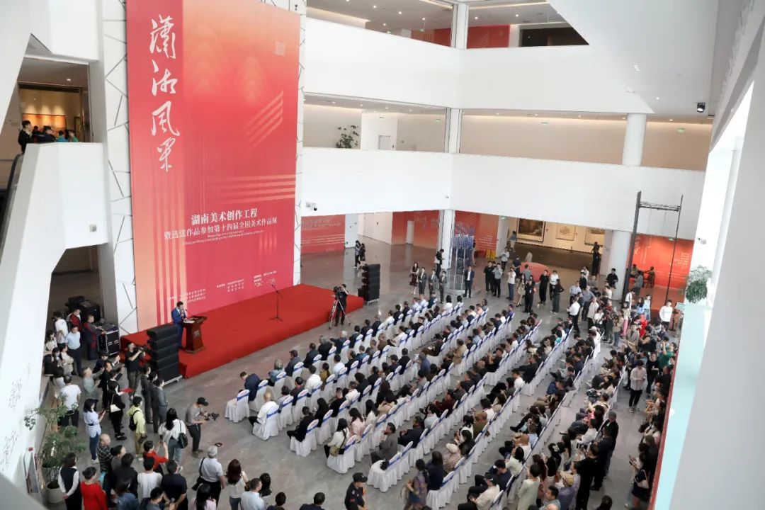 五年一届的“全国美术作品展览”是中国美术界最权威、规模最大的展览,是美术创作艺术上、学术上的一次大检阅。展览展出了五年来湖南美术事业高质量发展的丰硕成果,作品包括中国画、油画、水彩·粉画、版画、雕塑等共14大类别700余件作品,涉及山水胜景与历史文化名城题材、展现“三高四新”战略下工业科技进步题材、厚重的革命文化题材、反映乡村振兴战略成果的乡村题材、人文民俗风貌与文化遗产题材。五年来,美术学教师在习近平新时代中国特色社会主义思想的正确指引下,深刻把握习近平文化思想的重大意义、丰富内涵和实践要求,以满腔热情、匠心独运,积极创作,最终《风烟俱净》等6件作品入展。