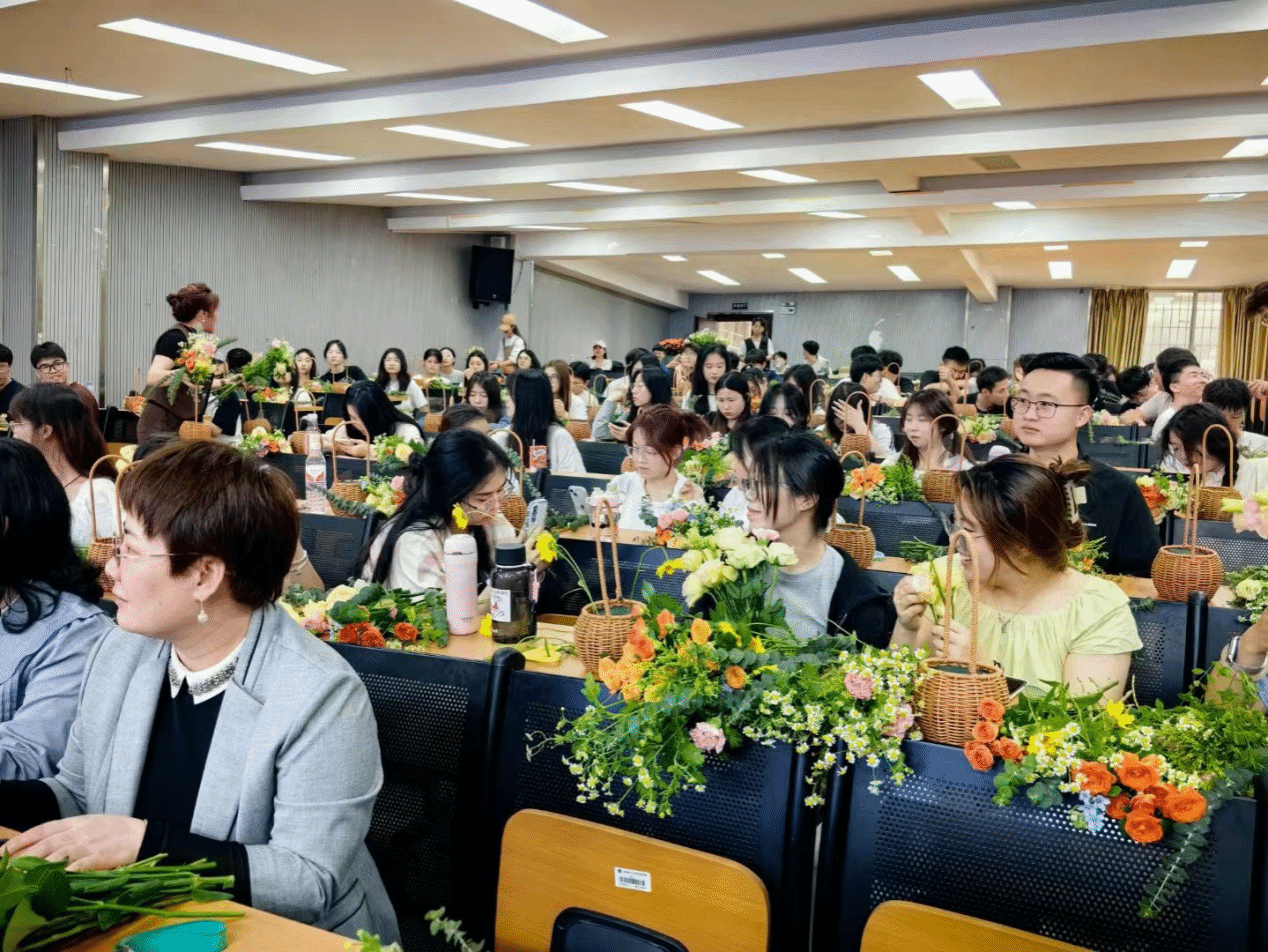 5月8日下午3点,美术与设计学院环境设计专业在逸夫楼的多媒体报告厅开展 “生活有花 心中有爱”为主题的插花实践教学活动,美设院分管常规教学的贺平副院长、校级设计学科的部分老师、环境设计专业全体教师及21级1-3班的同学到场参加,活动由校级设计学科、环境设计专业负责人谭娟老师主持。