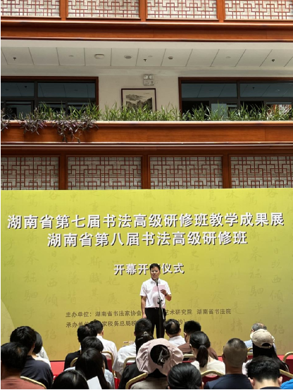 7月12日,湖南省第七届书法高级研修班教学成果展在国家税务总局税务干部学院(长沙)图书馆一楼展厅开幕,湖南省第八届书法高级研修班同步开班。本次高研班由省艺术研究院、省书法家协会、省书法院主办,国家税务总局税务干部学院(长沙)承办。