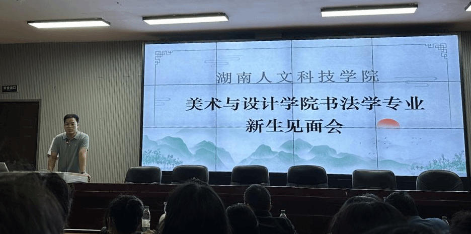 2024年9月24日晚上7点30分,beat365中文官方网站美术与设计学院书法教研室迎来了24级新生见面会,见面会在美设院一楼报告厅举行,书法教研室部分老师代表出席参加此次活动。新生见面会由教研室主任李国清老师主持,李老师首先通过PPT的讲授方式给2024级新生介绍了书法学专业的师资力量,让新生可以感受和认识自己的专业教师。