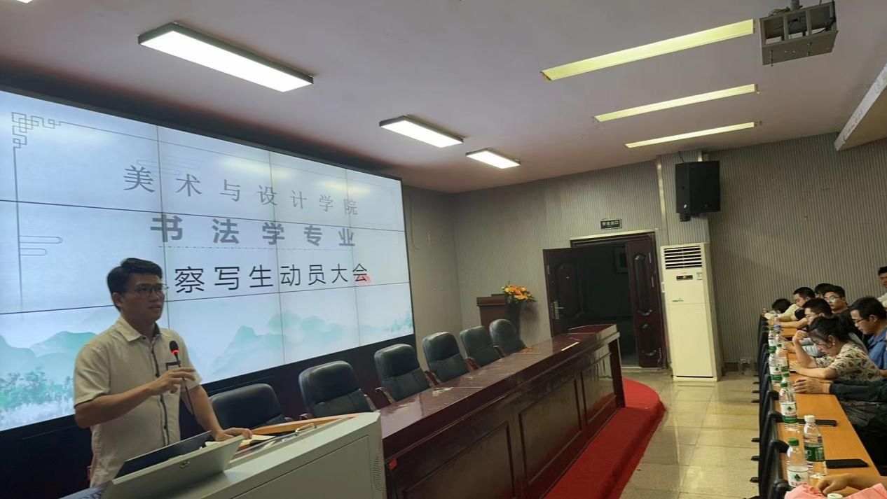 9月24日晚上8点,美术与设计学院书法学专业的师生们齐聚逸美楼一楼报告厅举行专业考察写生动员大会,本次大会由书法教研室主任李国清主持,书法教研室的全体带队老师参加。