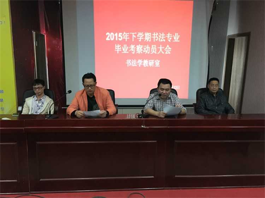 2015年10月13日,书法学教研室在逸夫楼一楼报告厅召开了书法学专业2013级外出考察采风动员大会。会议由刘风雪博士主持,书法学教研室易俊主任做动员报告,彭建成副教授、曾庆勋老师出席会议。
