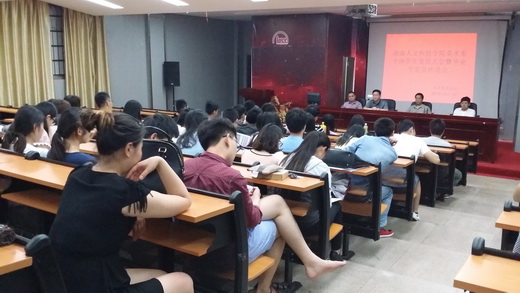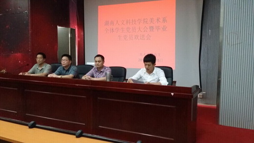2015年5月15日,美术系党总支在逸夫楼报告厅召开毕业生党员欢送大会,本次欢送大会由美术系副书记王东光主持,美术系党总支书记李小林、美术学党支部书记彭建成、设计学党支部书记李兰参加了本次大会。