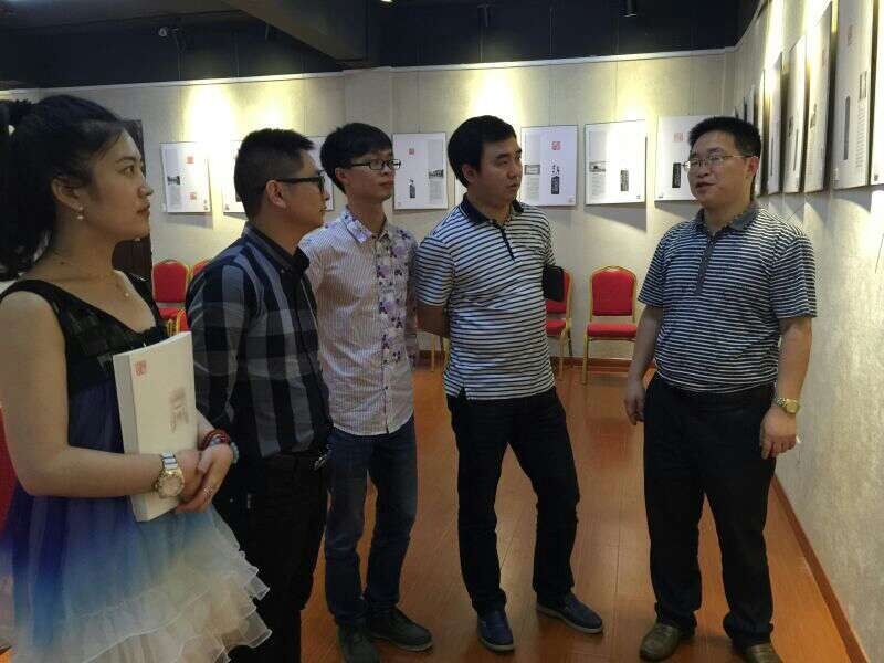 考察组观看了弘山书院正在展出的《长沙名胜地名篆刻作品展》,并同书院负责人曹江先生探讨了书法专业如何对接地方、服务社会以及书画艺术展览、艺术教育与本土文化对接的相关问题。
