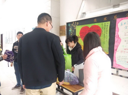 2015年4月7日至4月10日,美术学学生党支部和艺术设计学学生党支部在逸夫楼一楼接受学生党员和团员向贫困山区捐赠衣物244件、书籍50册、书画作品46幅和文具若干。此次慈善募捐活动由美术系党总支周密策划、组织和安排。