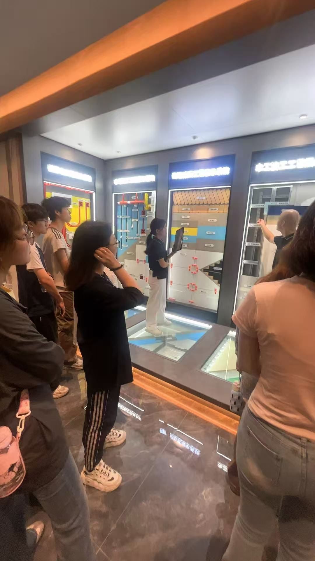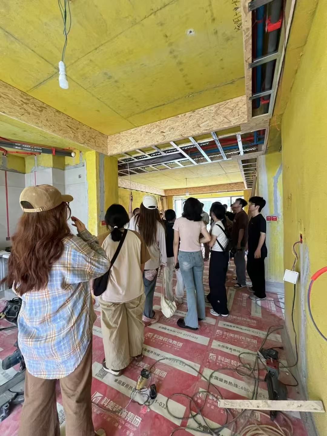 活动通过"展厅观摩-工艺解剖-趋势解析-工地实勘"四大模块,构建起完整的设计施工认知体系。美迪装饰设计总监贺甲云在数字化展厅开课时强调:"每个设计师都应该懂得材料会说话,工艺有灵魂。"通过企业发展纪录片,同学们见证了一家本土企业从传统家装到智能整装的时代跨越。在工艺解剖展区,水电隐蔽工程展示墙完整呈现了PPR热熔焊接工艺、强弱电分色布线规范等。科美装饰材料工艺区的沉浸式体验环节令人耳目一新。在1500㎡的实景工艺馆内,向学生们介绍从基层处理到面层施工的12道工序分解展示。"这种轻钢龙骨隔墙的减震垫安装,以往图纸上抽象的节点符号突然有了生命。"学生杨馥瑜在体验笔记中写道。材料对比区陈列着从传统石膏板到新型竹木纤维集成墙面的迭代样本,技术总监结合环保检测报告解读选材要点。科美软装总监通过场景演示,解析如何通过微水泥的肌理把控与弧形收口工艺,在极简设计中营造温暖质感。美迪工程部特别准备的"工艺避坑手册"引发热烈讨论,其中"卫生间防水分界线设置"与"地暖回填找平坡度"等20个常见问题图解,被同学们誉为"行走的工艺宝典"。 实地考察阶段,正在施工的南风苑小区项目成为最佳教学现场。学生穿行在管线林立的工地,智能放线机器人正在地面投射出精确的定位网格。"以往在课堂理解的'放线精度±3mm'概念,此刻在激光定位仪的红色光幕中变得真切可触。"带队教师林燕表示,这种零距离接触让教学实现了从平面图纸到立体空间的维度突破。