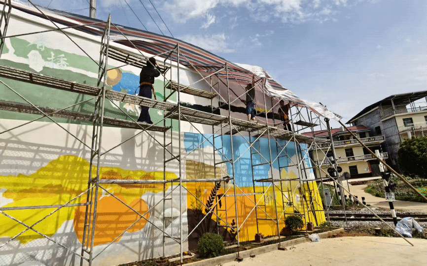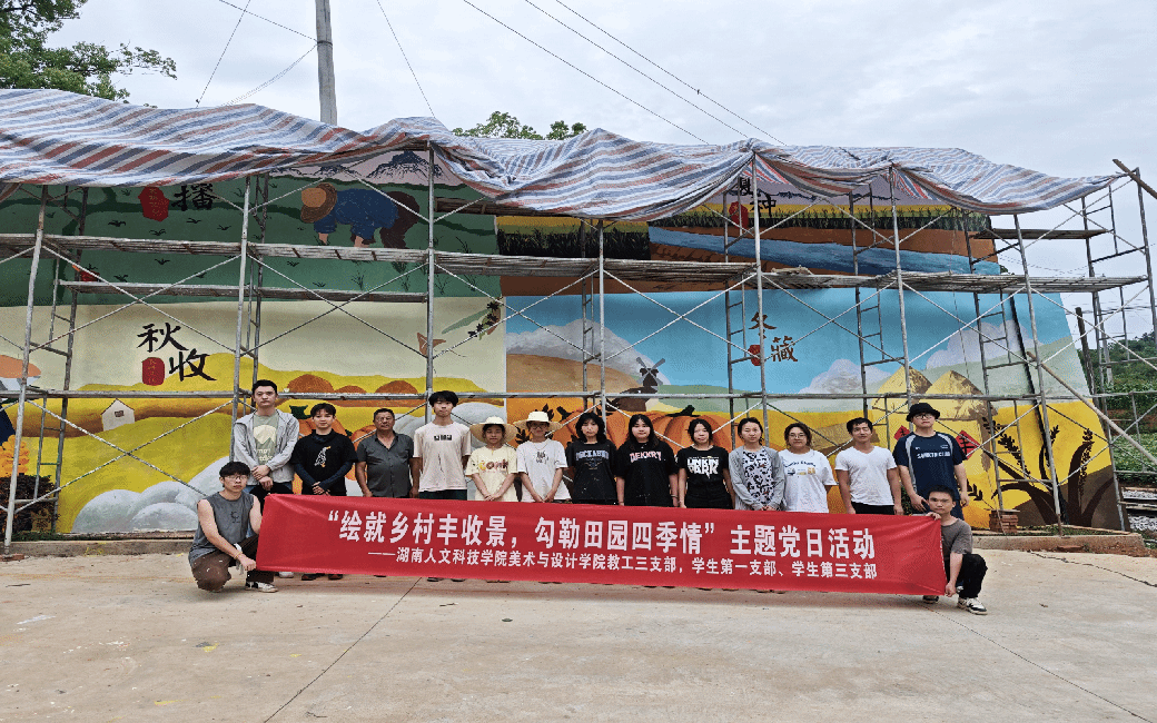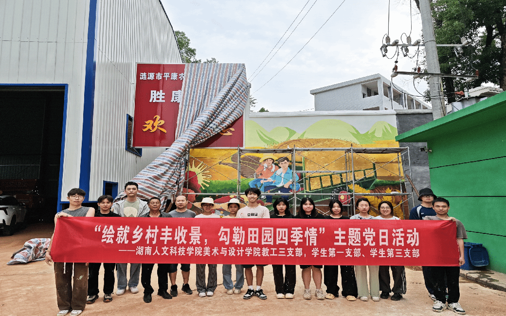 2025年5月21日,在美术与设计学院党总支书记阳立新的指导下,我院教工三支部、学生一支部和学生三支部的师生到涟源市渡头塘镇开展校地合作的墙绘活动。经过师生4天的共同努力,在两幅别具匠心的大型墙绘作品精彩亮相,为乡村增添了绚丽色彩与文化韵味。此次活动不仅是一次艺术创作的实践,更是一堂生动的美育课,将课堂延伸至乡村田野,让学生在实践中感受美、创造美、传播美。