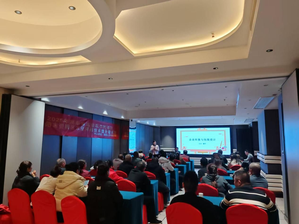 首场讲座于2025年12月18日在娄底欢致酒店举行,面向“高素质农民培训班——邵东班”的近百名学员。童玲教授从品牌识别系统(CIS)入手,结合湖南本地农产品案例,深入浅出地讲解了企业形象塑造的核心要素,并重点剖析了包装设计在产品营销中的关键作用。学员们纷纷表示,讲座内容实用性强,对打造本土特色农产品品牌具有重要启发。