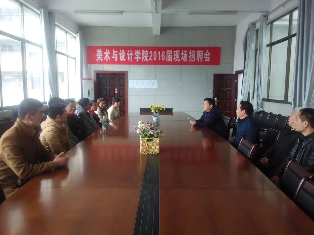 下午,美术与设计学院2016届毕业生专场招聘会在逸夫楼二楼会议室举行。此次招聘会由我院招生就业领导小组负责组织,李小林书记、就业专干到现场主持招聘工作。李小林书记对此次招聘公司作了简单介绍,并与招聘方讨论了一些有关毕业生就业的具体事宜,并对其来我院举行招聘会表示感谢。