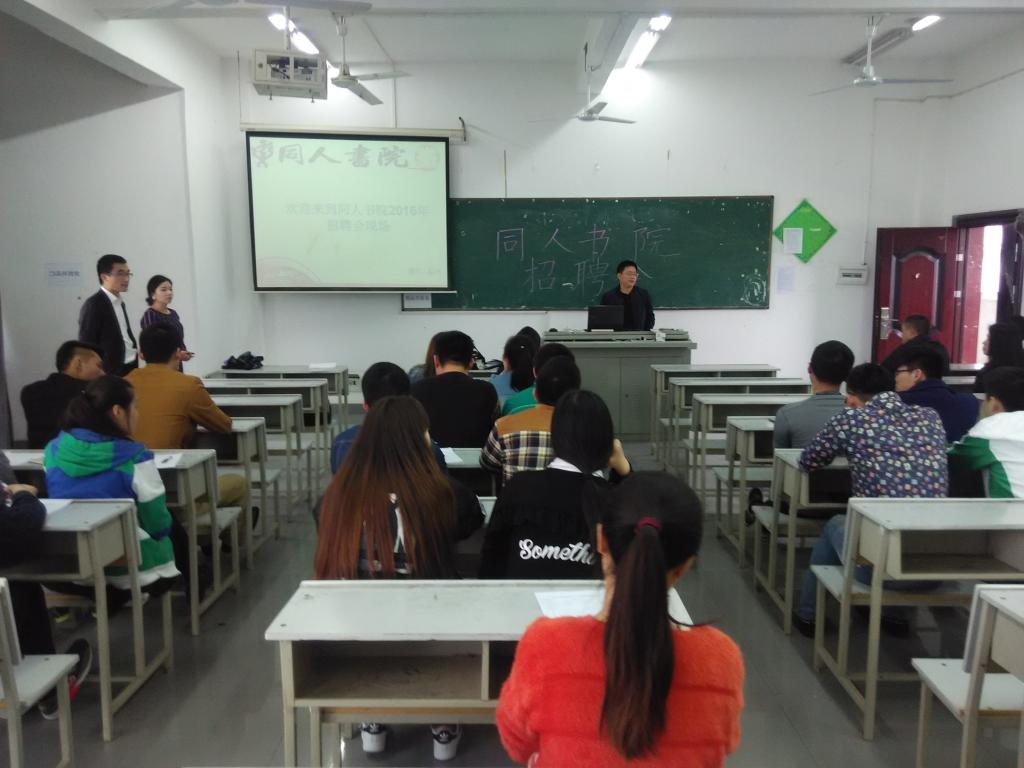为进一步推进2016届毕业生的就业工作,4月12日下午,美术与设计学院在学校春季大型招聘会后,专门邀请同人书院来我院作专场招聘会,此次招聘会由我院就业领导小组负责组织,李小林书记、王东光副书记、书法专业曾庆勋老师、就业专干到现场主持招聘工作。李小林书记对此次招聘公司作了简单介绍,并对其来我院举行招聘会表示感谢。同人书院相关负责人对其书院的基本情况作了介绍,并对我院领导、老师的热情招待表示感谢。