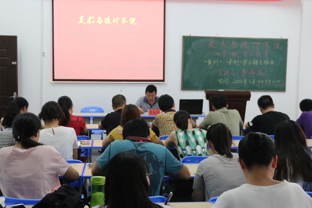 为推进“两学一做”学习教育,6月14日下午3::00,美术与设计学院在逸夫楼美设楼310多媒体教室举行“两学一做”学习教育报告会,邀请原校党委副书记李尚益作关于《中国共产党廉洁自律准则》、《中国共产党纪律处分条例》学习辅导报告。院党总支书记李小林主持报告会,学院全体教职工党员、学生支部支委人员参加了学习。