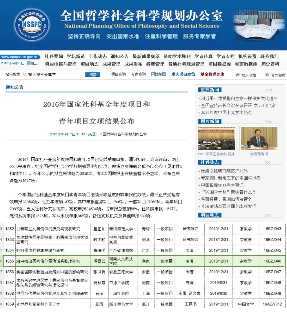 近日,全国哲学社会科学规划办公布了2016年度国家社科基金项目评审结果,美术与设计学院毛攀云副教授主持的“湘中梅山民间信仰图像谱系整理研究”获得国家社科基金项目立项资助,这是我院科研项目的一个重大突破。