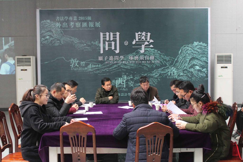 考察带队老师刘风雪汇报了西安、敦煌、洛阳等地考察安排及书法专业考察的相关学术问题。与会领导就考察展览存在的问题及考察教学效果进行了研讨。针对书法学专业考察的特殊性,提出改革考察方式(分小组分课题专题考察)、利用现代科技手段及借鉴西方现代和后现代艺术作品进行跨学科、跨专业展现等方法,以发挥专业考察最大的教学效果。