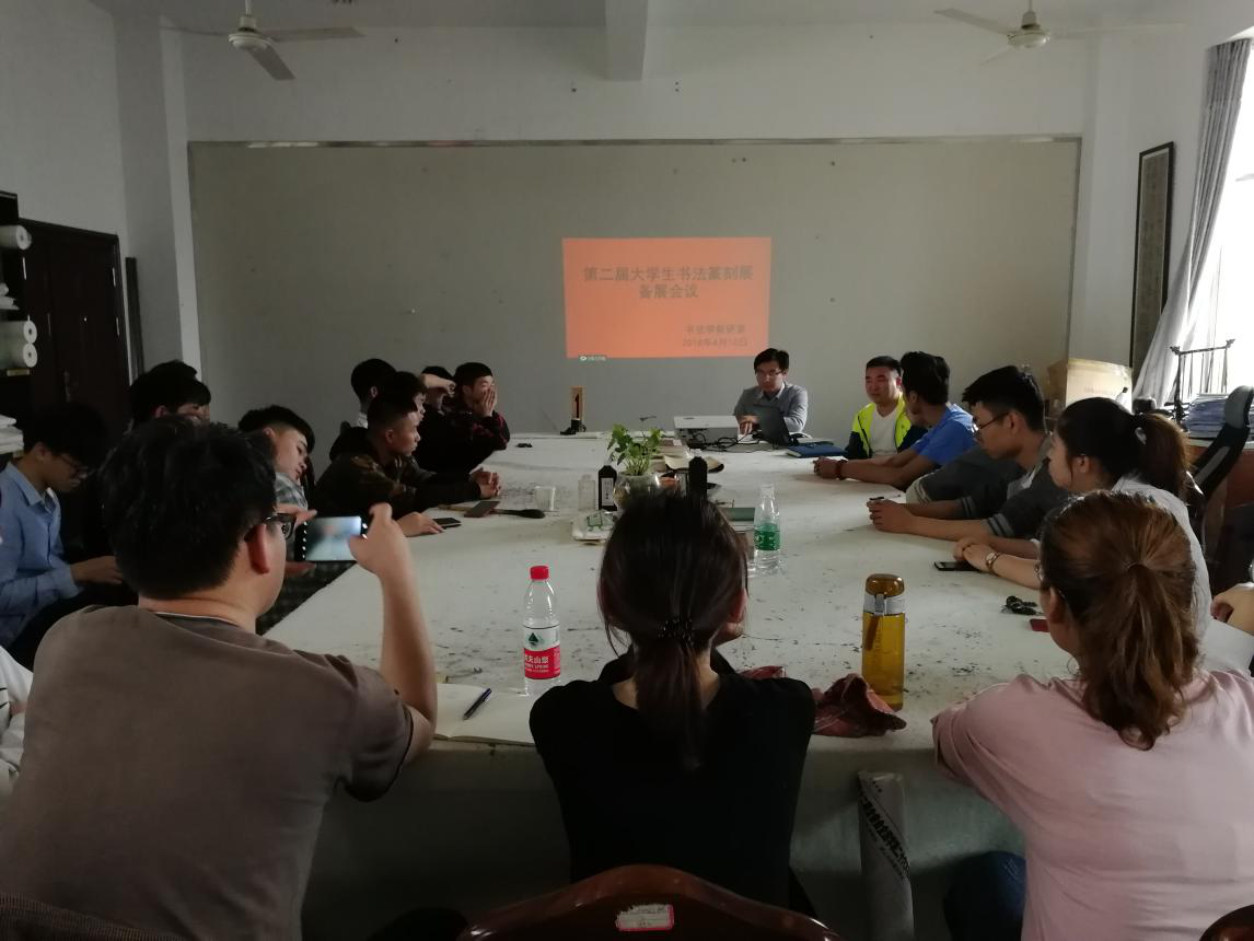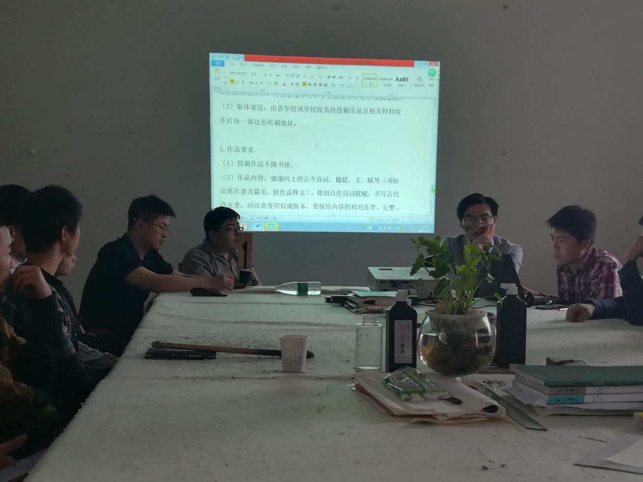 会议由教研室主任蒋全顺主持。蒋老师简单介绍了本次会议的目的,重点分析了本次大学生书法篆刻展的要求等。贺文彬、谷重、杨金榜老师分别与大家分享了个人参展的经验,并讲解了备展的注意事项。最后易俊副书记总结发言,希望同学们能够积极备展,体现我们院书法学专业的实力和风采。