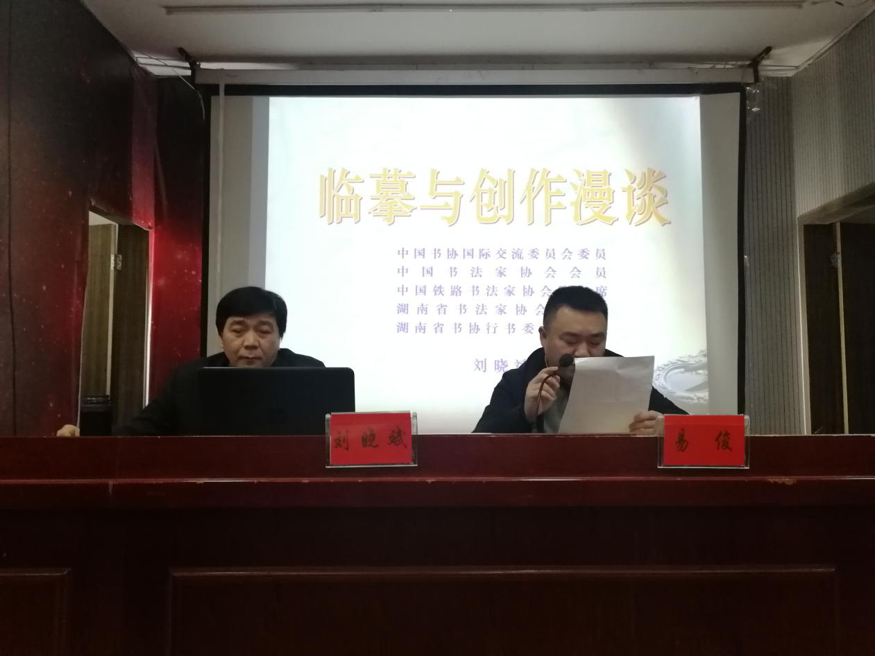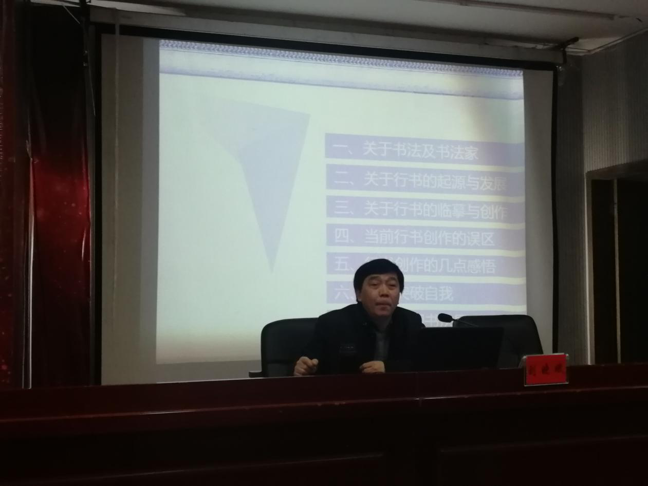 讲座由院党总支副书记易俊主持。易俊副书记介绍了刘晓斌先生的艺术简历,并对刘晓斌先生的到来表示热烈欢迎。刘晓斌先生结合自身的艺术创作从书法及书法家、行书的起源与发展、行书的临摹与创作、当前行书创作的误区、行书创作的几点感受、如何突破自我、国展参展的几点技巧七个方面进行深入剖析。