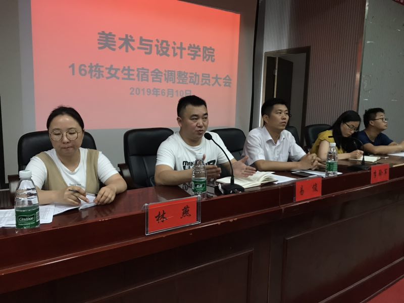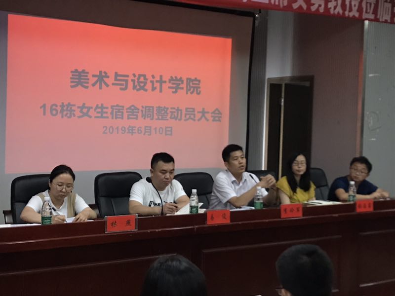 6月10日中午12时,美术与设计学院在逸美楼报告厅召开16栋女生宿舍调整动员大会。出席本次会议的有学工处李玲军副处长、美术与设计学院党总支易俊副书记、学工办主任张晶露老师、辅导员林燕老师、张尚老师。我院涉及16栋调整的所有学生党员、预备党员、入党积极分子、班干、学干、寝室长参加本次会议。