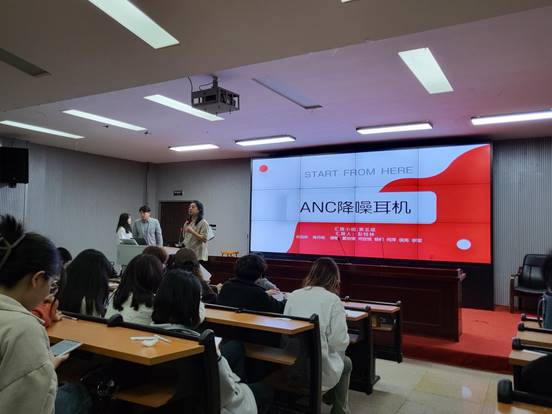 讲座中,曹丹跟师生们主要分享了自己曾经参与的品牌广告设计案的设计过程和比稿经验。接着,参与《广告设计与策划》课程学习的2020级同学们以小组比稿的方式进行了课程汇报。曹丹、童玲、罗娇组成的评审团按照行业标准对八个小组的汇报进行了打分,最终评选出了最佳提案人和最佳提案小组,并由评审团发给了锦旗作为特别奖励。