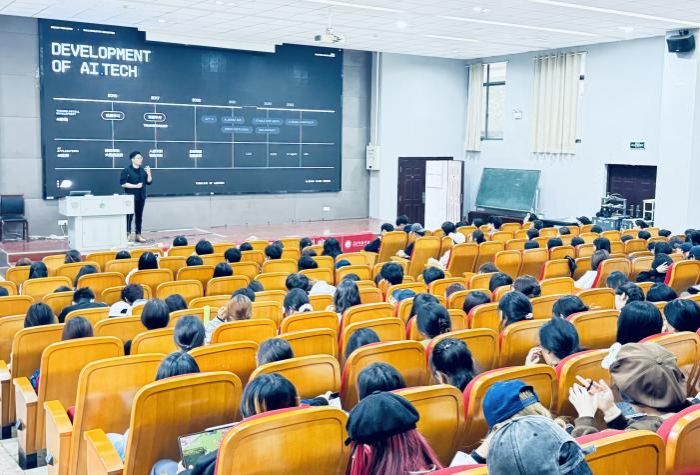 活动现场,阿里云AI PAAS设计负责人、阿里云高级体验设计专家杨涛老师,以其深厚的专业底蕴和独到的见解,为在场学生带来了一场精彩的分享。他详细介绍了阿里云在AI领域的前沿探索,展示了阿里云设计团队如何通过新平台和工具,推动设计实践创新,促进高校合作并加速产业落地。杨涛老师通过具体案例与生动的展示,解答了AIGC在实际设计工作中的应用场景,启发了学生们对AIGC技术与设计结合的思考。